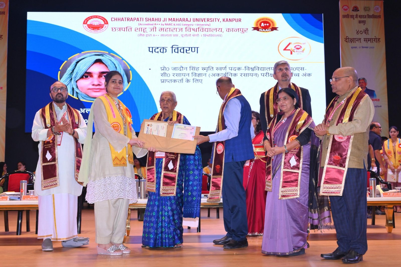 इटावा।छत्रपति शाहूजी महाराज विश्वविद्यालय कानपुर के वर्ष 2025 के दीक्षांत समारोह में 17 सितंबर को के.के.डिग्री कॉलेज इटावा के प्रोफेसर रहे जादौन सिंह की स्मृति में रसायन विज्ञान में बेहतर प्रदर्शन के लिए प्रोफेसर जादौन सिंह स्मृति स्वर्ण पदक राज्यपाल और कुलाधिपति आनंदीबेन पटेल ने पी.पी.एन. कॉलेज कानपुर की छात्रा अल्हाना को प्रदान किया।