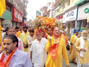 यज्ञस्थल से ढोल-नगाड़ों और भजन-संकीर्तन के साथ निकली पालकी को भक्त श्रद्धालुओं ने कांधे पर उठाया। पीले रंग की ध्वज-पताकाएं लिए माताओं, बहनों और बेटियों की भारी संख्या में उपस्थिति ने यात्रा को भक्तिमय बना दिया। यात्रा रामलीला रोड से शुरू होकर भारों वाला चौराहा, तहसील चौराहा, बलदेव चौराहा, राजागंज चौराहा, पचराहा, कोतवाली चौराहा, नगर पालिका चौराहा, तिकोनिया, नौरंगाबाद चौराहा, साबितगंज चौराहा, रामगंज चौराहा, कटरा सेवाकली और तकिया आजादगान होते हुए पक्का बाग चौराहा से पुनः यज्ञशाला पर पहुँची।